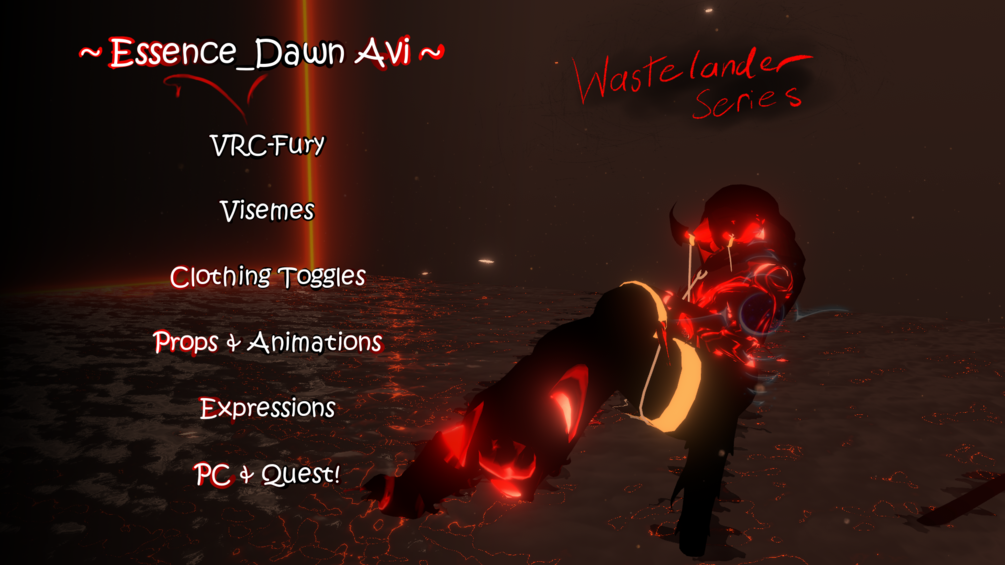VRC-Fury (goloco), Visemes, Clothing toggles, a scythe, tail idle toggle, Expressions and is both Quest and PC compatible!